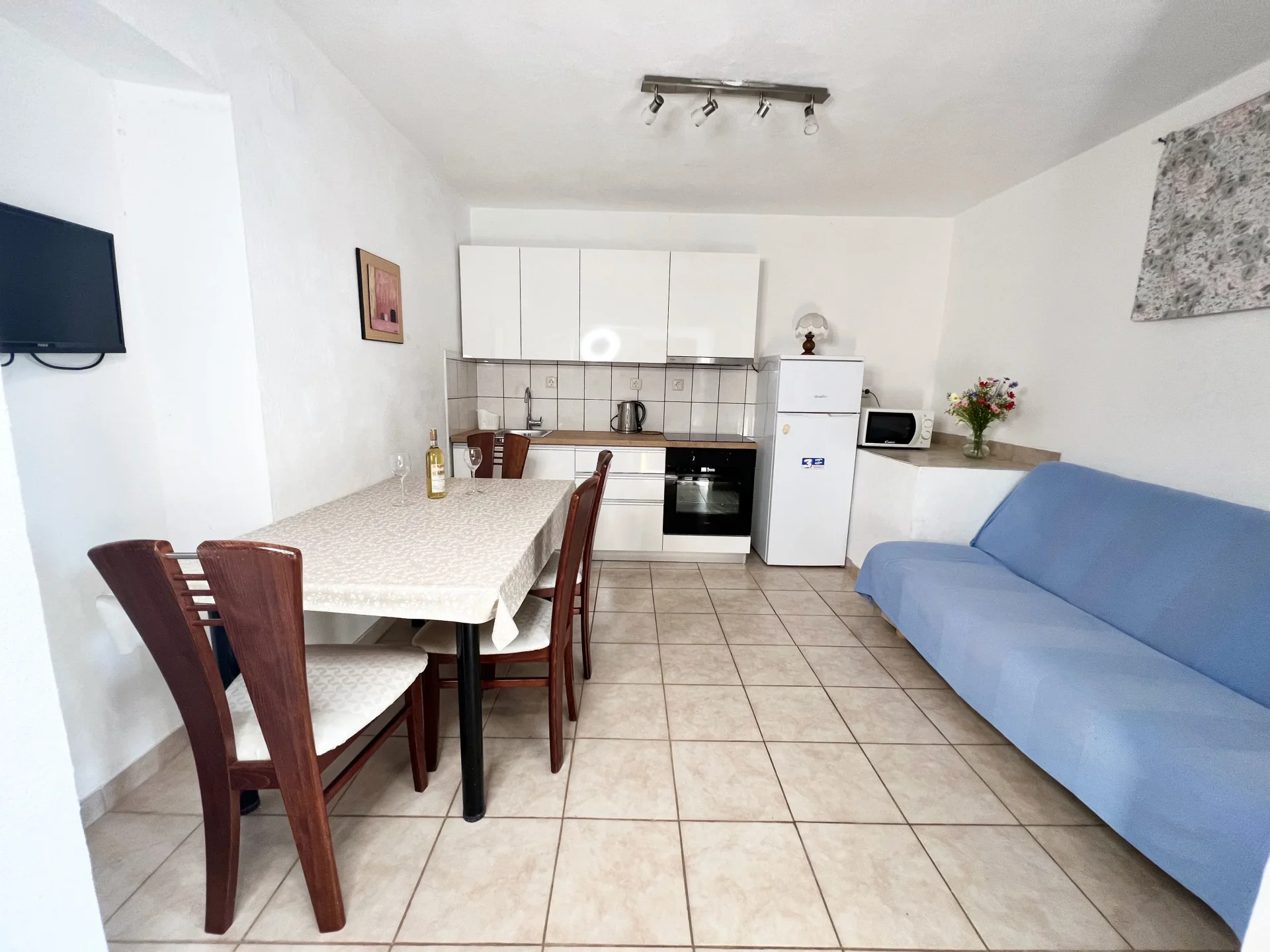 U dnevnom boravku nalazi se kauč za spavanje dimenzija 120 × 200 cm.