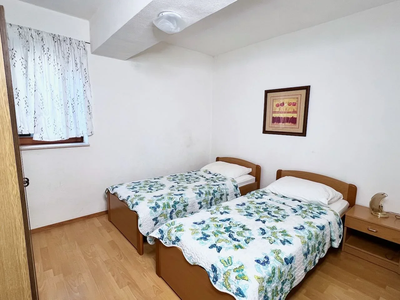 Jedna spavaća soba opremljena je udobnim bračnim krevetom 160 × 200 cm, dok se u drugoj nalaze dva odvojena kreveta 90 × 200 cm.